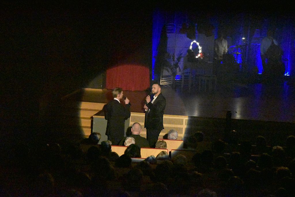 I prosi o wino – z widowni podrywa się grzeczny pan i nalewa odrobinkę do kieliszka – dlaczego tak oszczędnie? – upomina, więc polewa hojniej.