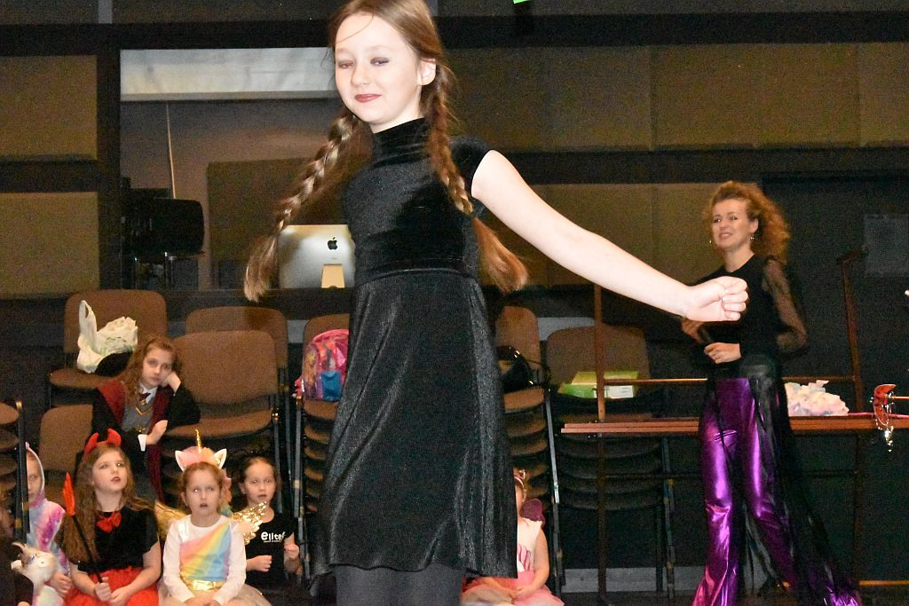 Nad całą tą czeredą fenomenalnie panowała czarowna wodzirejka Pani Prof. Kasia, tańcząc, podśpiewując, a przed wszystkim dyrygując (w tym czasie Pani Dyrygent Natalia ulegle poddawała się poleceniom koleżanki) tańcem, rewią mody i pokazem wszystkich wymyślnych, bo wymyślonych przez dzieci, a zrealizowanych przez Rodziców, strojów.