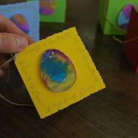 3. Czym ozdobimy bilecik? Będzie to pisanka 🙂 Postaraj się dopasować jej wielkość do wymiarów biletu. Namaluj kilka kolorowych plam, wytnij kształt pisanki. Jeśli chcesz aby pisanka odstawała od podłoża, możesz do niej przykleić kawałek zagiętego w harmonijkę papieru.
