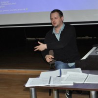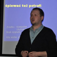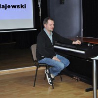 Artur Majewski znalazł najwspanialszy patent na życie – robić to, co się kocha, co sprawia przyjemność, co daje satysfakcję. I w czasie opowieści o muzykowaniu, uśmiech nie schodził mu z twarzy. Nie pominął też zapowiadanego wyjaśnienia, czym jest pedalizacji harfy. Nazwa czynności, która budzi jakieś dziwne skojarzenia, wynika po prostu z faktu, o którym mało kto zdaje sobie sprawę, że harfa ma aż siedem pedałów, po jednym do każdego dźwięku. I harfiarka nie tylko płynnie przesuwa zwinnymi paluszkami po czterdziestu siedmiu strunach, co oglądamy, lecz – tego nie widać – także niemal tańczy, odpowiednio naciskając pedały, które zmieniają ton dźwięków. Niestety tego nie pokazał, chociaż gra na gitarze, fortepianie, a nawet puzonie. O innych instrumentach, które opanował, skromnie nie wspomniał. Za to pozwolił posłuchać aranżacji, które przygotował dla swojego niegdyś profesora, teraz przyjaciela, Sebastiana Perłowskiego, znakomitego dyrygenta, współpracującego z Operą Krakowską oraz Orqesta Metropolitana de Lizboa, twórcy zespołu Perła Big Band. Zabrzmiała muzyka z najlepiej zarabiającego filmu o Bondzie – Skyfall, wyśpiewana przez Adele, standard Luisa Amstronga On the Sunny Side of the Street Benny Goodmana w aranżacji Artura Majewskiego. Najwięcej radości słuchaczom sprawił żart muzyczny, zatytułowany Zombiaki, który ukazał umiejętności muzyczne i wokalne Artura i Michała Łypa (muzyka i akustyka w jednym) -obaj grali i śpiewali. Jak oni wyli!!!!! Coś fenomenalnego.
